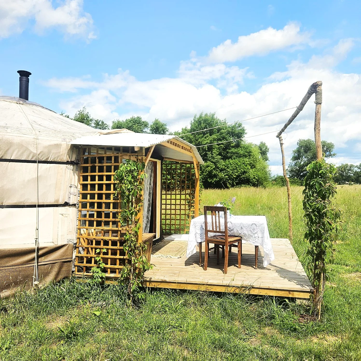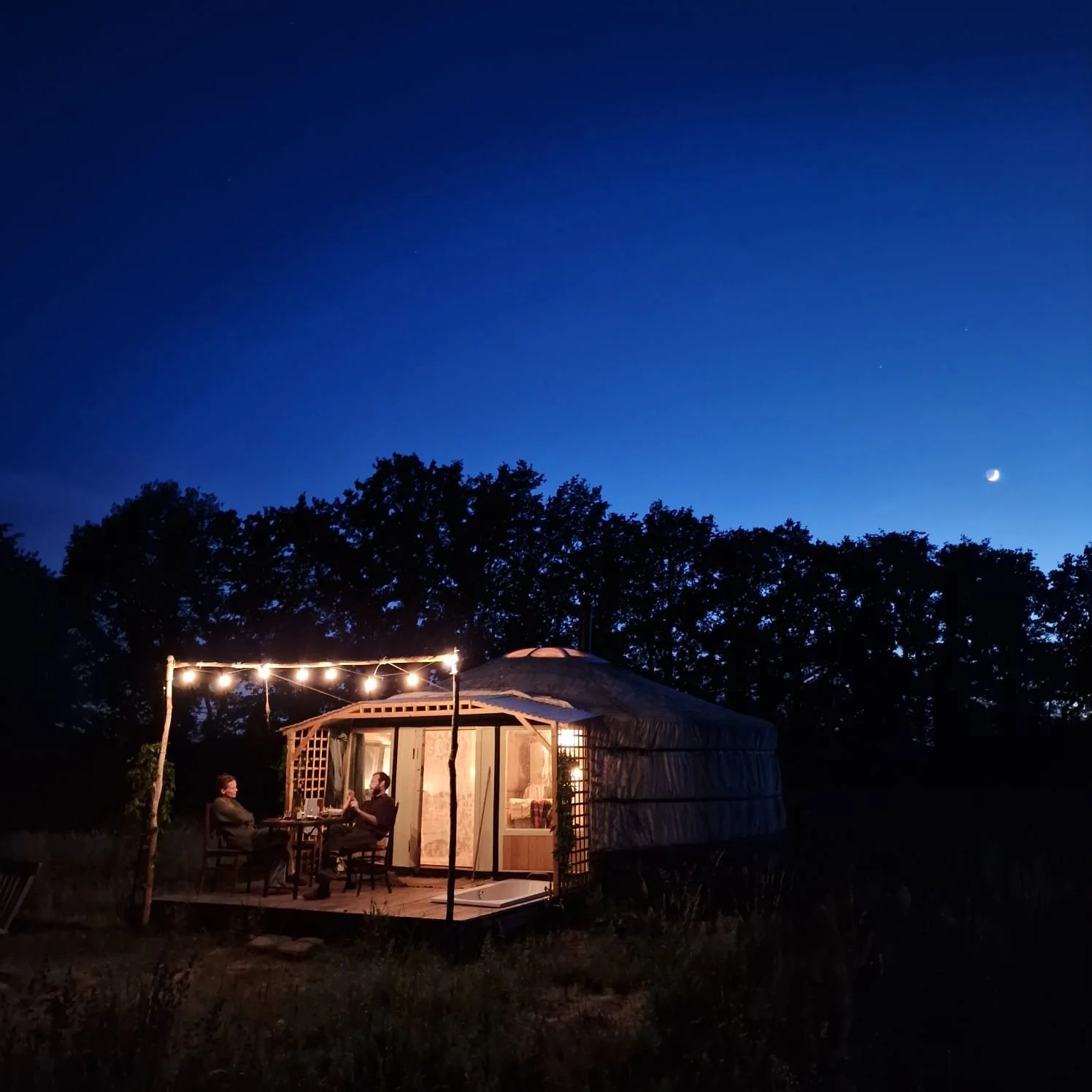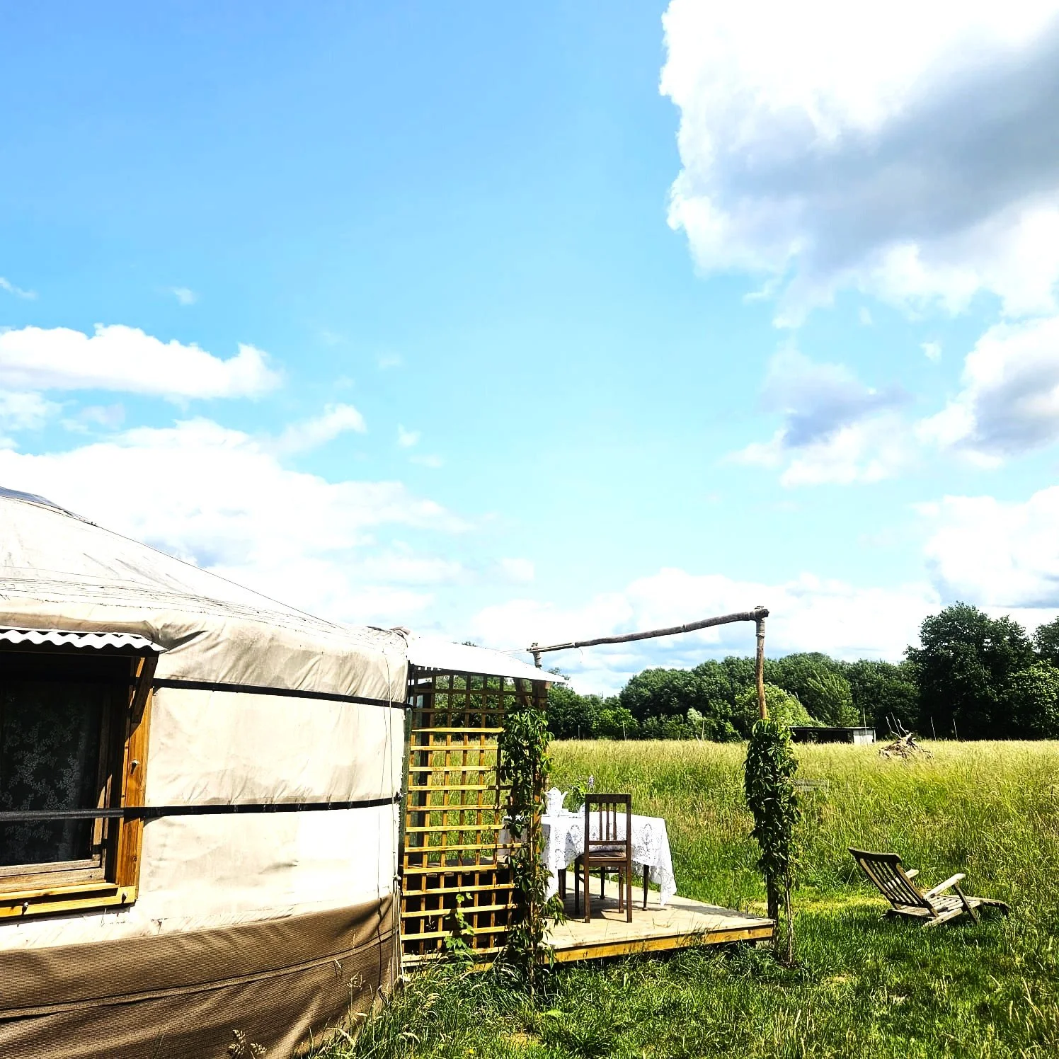 De oude yurt is nu een romantische overnachtingsplek met eigen keuken, badkamertje, en een buitenbad. Je kan deze boeken via https://strackxhoeve.be/velterusten/